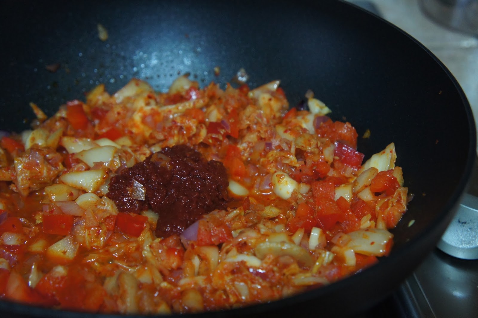 | Add 1 tbsp kimchi paste or gochujang. Stir fry for about a minute till the ingredients start to emit aroma. |